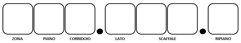 Questo schema di Ubicazione consente di poter rappresentare in modo preciso e semplice una determinata posizione all'interno del proprio magazzino. Con la stessa semplicita' l'ubicazione generata puo' essere decifrata in modo molto intuitivo dall'operatore.